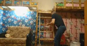 Тук авторът на проекта опрости решението на проблема. Той избра неутрален дизайн за леглото, стълбите и силовата рамка. Работно място с подвижно нощно шкафче на колела е сглобено от подобни елементи. Тук може да се постави всеки диван, ако е необходимо.