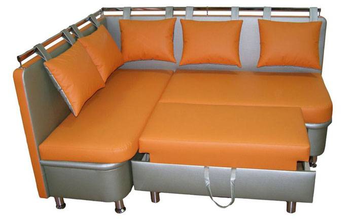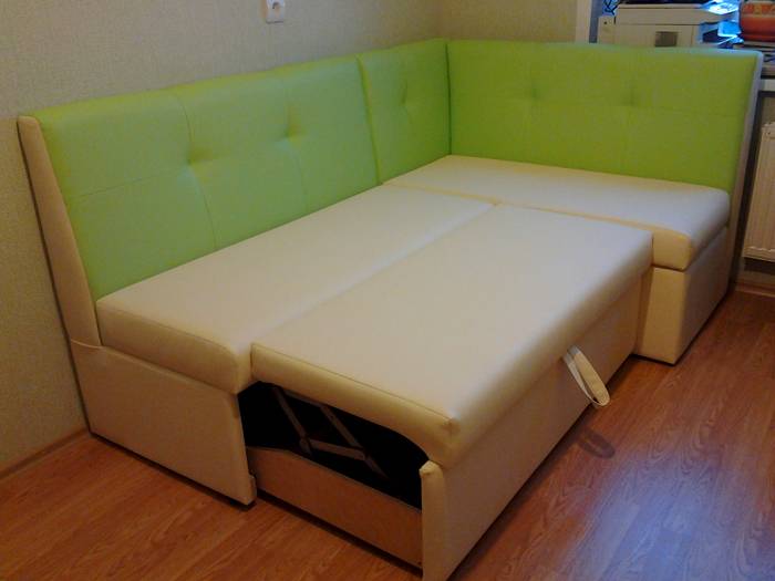 Ако е необходимо, ъгълът може да бъде разширен, за да се образува пълноценно легло. Изборът трябва да се направи от наличието на финансови възможности. Един прост модел, оборудван с меки седалки, може да се превърне в достъпна опция, ако планирате да използвате койката само от време на време. Ако някой от членовете на семейството редовно ще спи в кухнята, по-добре е да изберете мултифункционален ъгъл с траен конструктивен механизъм и кожени седалки.