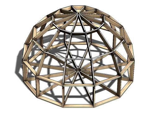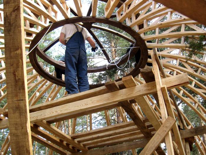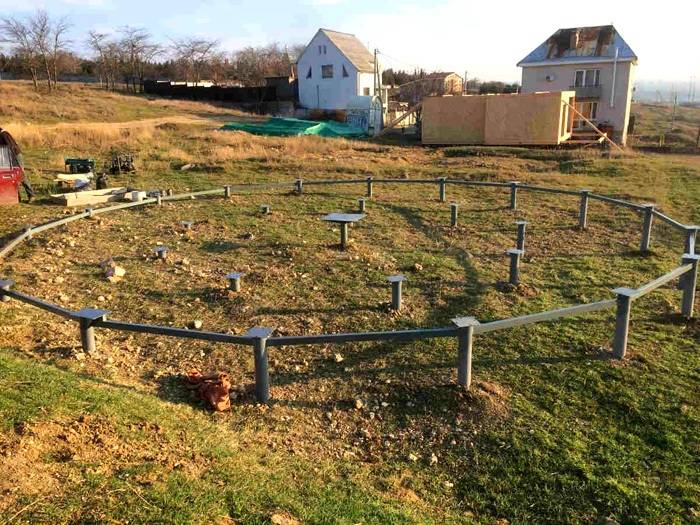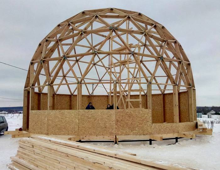 В някои случаи може да се използва допълнителна, така наречена, временна рамка или опори. Ролята му се свежда до поддържане на купола до момента на набор от материали, след което той ще бъде демонтиран. Понякога проектът предвижда носещи колони или стени, върху които също се опира куполът. Те се издигат едновременно с рамката. Основната рамка, външна, е монтирана според принципа на триъгълните ръбове, което ви позволява да променяте формата на къщата във всяка посока.