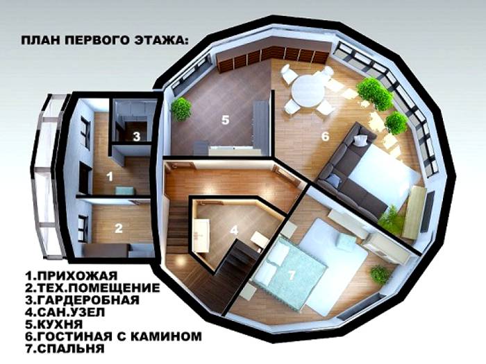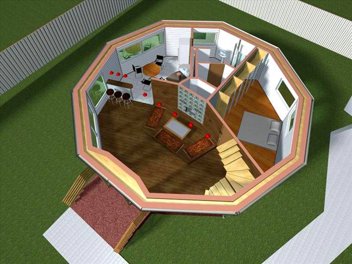 Истински полет на въображението започва с оформлението на вътрешното пространство. Сферичният дизайн дава възможност за много интересни дизайнерски идеи. Трябва да се отбележи, че не всички от тях могат да се дължат на практичност и функционалност. Предлагаме да разгледаме проекти, снимки на кръгли къщи: