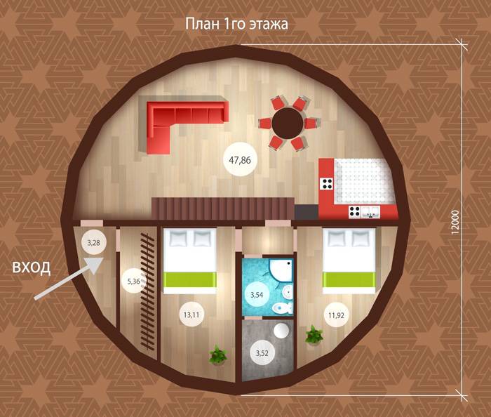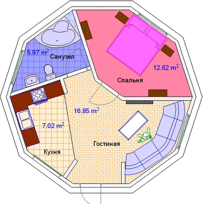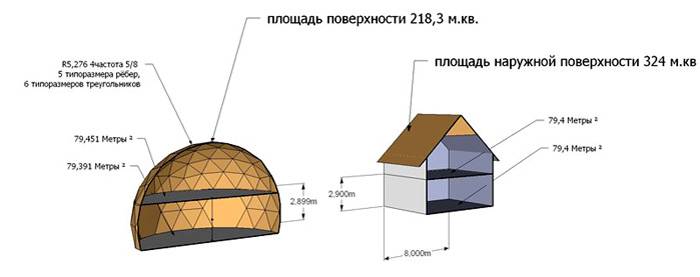 Забележка! Общата площ на стените и тавана в обикновена къща ще се различава от площта на стените на куполна къща, заоблена в тавана, с приблизително еднаква - 30-35%. Това води до допълнителни икономии на строителни материали.