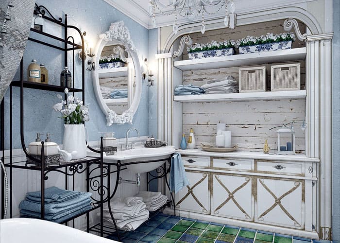 ОТНОСНО прованс може да различи цвета на мебелите: това са бели тонове, нюанси на люляк, светло синьо, бяло мента, пастелни тонове.Необходимо е наличие на пукнатини, ожулвания. Продуктът може да включва ковани метални елементи.