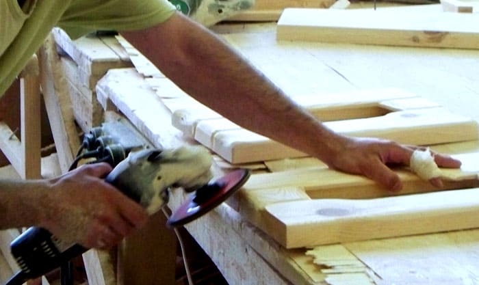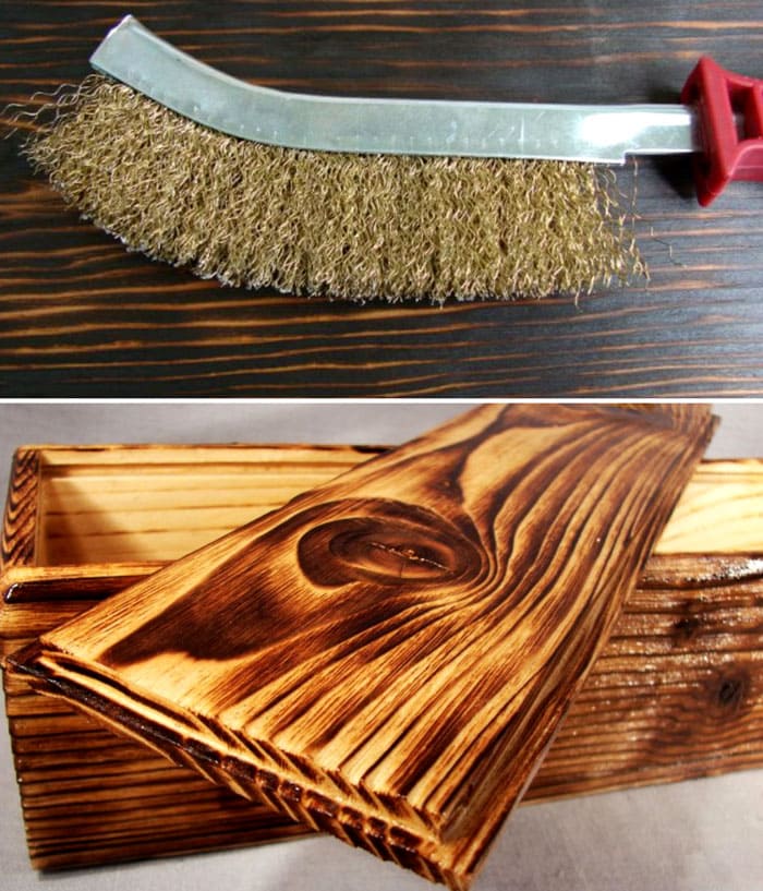 Задачата е да се работи активно с твърда метализирана четка върху горния слой дърво. Той трябва да бъде напълно отстранен, като отдолу се разкриват текстурни влакна.