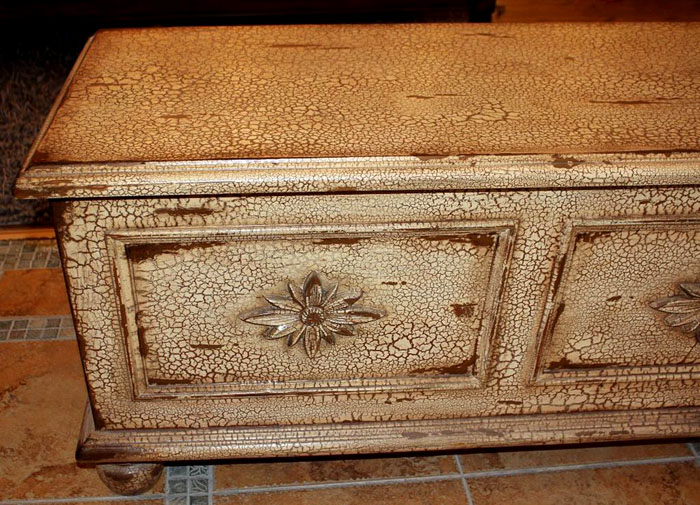 Кой не знае, има много интересен лак, който създава ефект на напукване. Това чудо се нарича "craquelure" или "crackle". Първо, основата се нанася върху материала: според цвета те избират опцията какъв цвят трябва да бъдат пукнатините. Веднага след като основата изсъхне, нанесете лака craquelure. Важно е да приложите всички щрихи в една посока и не забравяйте да добавите цвят.