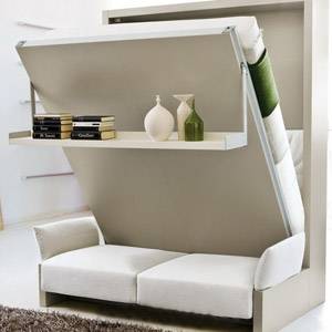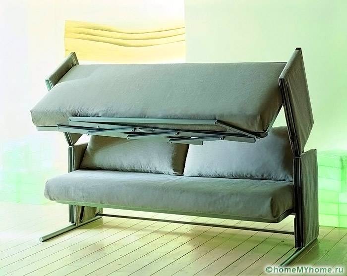 Някои модели дивани могат да бъдат превърнати в двуетажни легла. В този случай мястото за спане може да бъде разположено на втория етаж, а гардеробът, работното бюро и рафтовете за книги са разположени отдолу.Правилен избор мебели ще ви позволи да поставите хол, офис и място за спане на малка площ.