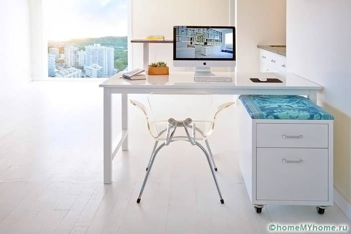 Моделът е оборудван с просторни чекмеджета[/ надпис]Винаги можете да си купите маси под формата на мебели-трансформатори за малък апартамент или да ги направите по поръчка. Подобни дизайни представляват композиции за трапезария за кафе, масичка за кафе и работно място, както и маса и система за съхранение.