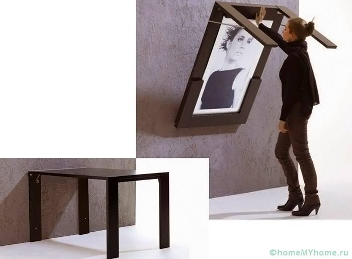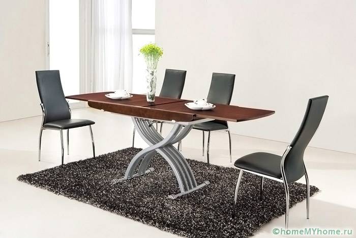 Дори в разгънато състояние подобна структура не заема много място.[/ надпис]- популярна трансформаторна стъклена маса. В сгънато състояние представлява малка масичка с метални крака. Ако е необходимо, масата може да бъде повдигната с помощта на страничните секции;