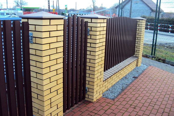 Може би този тип фехтовка е най-интересното решение. Особеността на инсталацията е, че основата първоначално се излива под стълбовете и след това се полага тухла или градивни елементи. Такава ограда е не само красива, но и трайна. Когато полагат тухли, работниците оставят ипотеки за свързване с надлъжни трупи чрез заваряване или използват анкери. Дизайнът ще изглежда масивен.