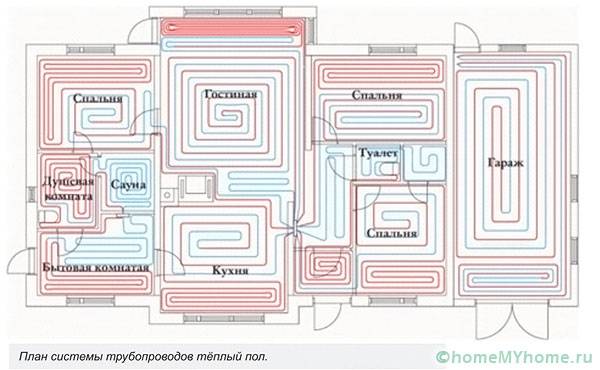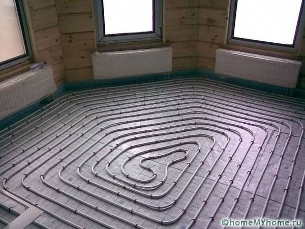 Полезна информация! Видът на монтажните схеми за подове с водно отопление в частна къща зависи от метода на отопление и геометричните форми на стаята. Основното отопление се извършва със спирали и двойни панти, докато допълнителното отопление се извършва с единични панти.