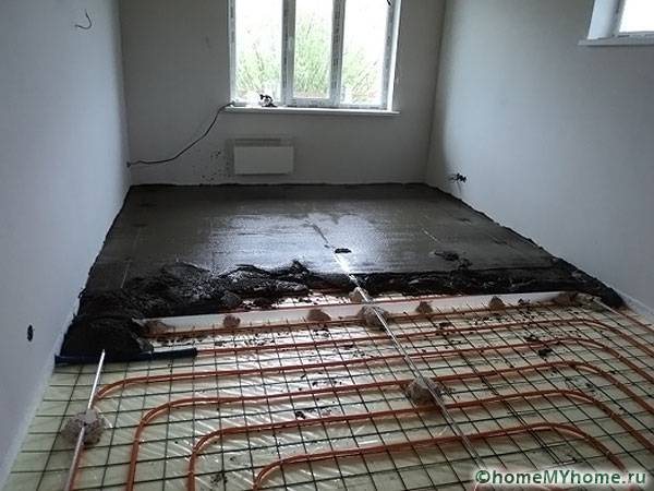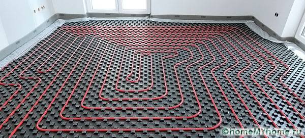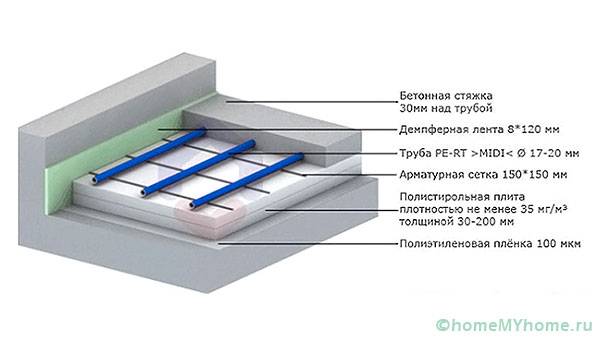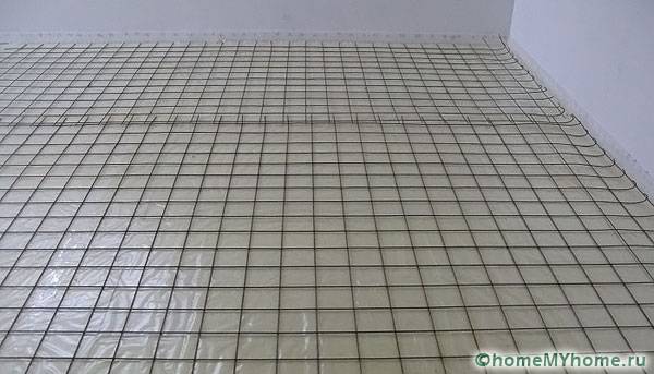Водопроводите се монтират с помощта на специална мрежа, фиксиращи листове от полистирол или набраздени плочи. Подготвената основа е покрита с хидроизолационен филм.По време на монтажа върху топлоизолационния слой се поставя подсилваща мрежа, върху която е монтиран тръбопроводът. Преди да продължите с монтажа на тръби, е необходимо да изчислите оборудването, за да осигурите необходимия топлообмен, като вземете предвид загубите. Тръбопроводът е монтиран към рамката с помощта на скоби. Над магистралите е монтирана и подсилена замазка.