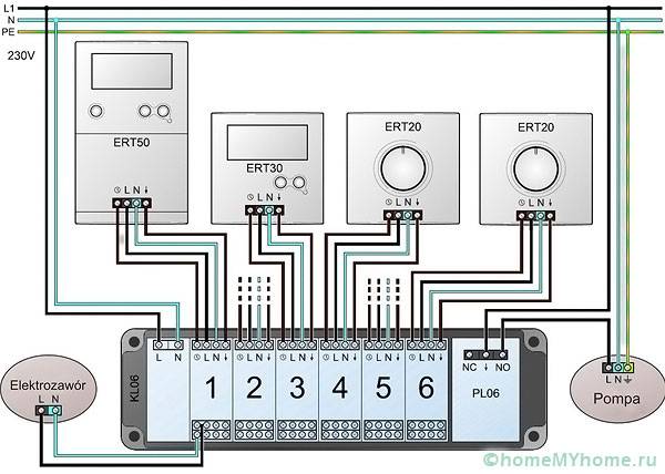След извършване на изчисления за избор на оптималната стъпка между завоите, както и определяне на мощността на котела и закупуване на колектор и термостат свързването на избраните електрически схеми за подове с водно отопление в частна къща е направено: