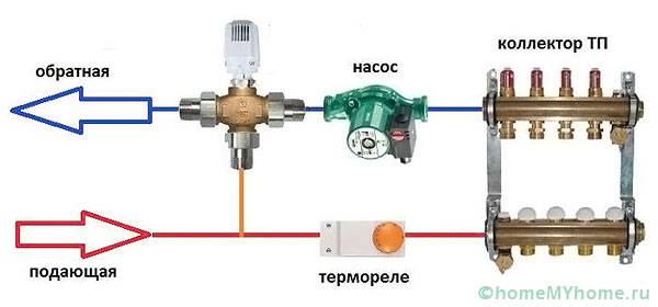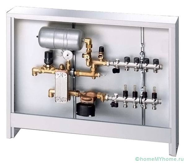 Линията от котела е свързана към устройството на колектора. Монтира се в подготвен шкаф. Основният напускащ колектор е монтиран над необходимата площ съгласно избраната схема, а връщащият тръбопровод е свързан с обратния колектор. Ако са монтирани различни клони, тогава колекторът е оборудван с определен брой входящи отвори.