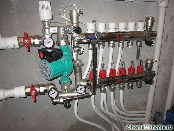 При свързване на системата към котелното оборудване се използват различни колектори. Системата започва помпено оборудване и автоматични механизми за контрол на различни параметри.