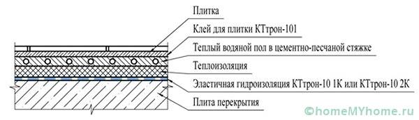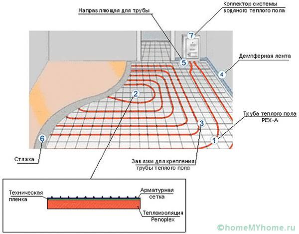 Компонентите на механизма за подово отопление са нагревателни елементи вътре в пода. Когато избирате електрически схеми за подове с водно отопление в частна къща, трябва да се има предвид, че такава структура има слоеста структура.