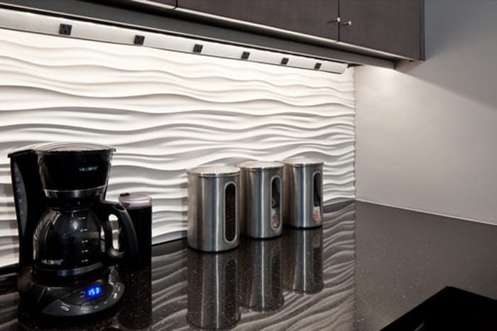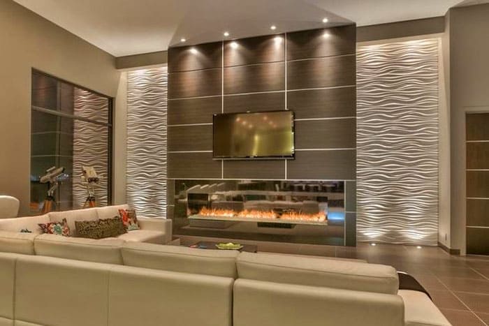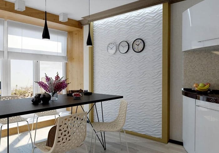 Malah bahagian kecil dinding dengan kesan 3D akan kelihatan lebih elegan di bahagian dalaman keseluruhan daripada kemasan sederhana