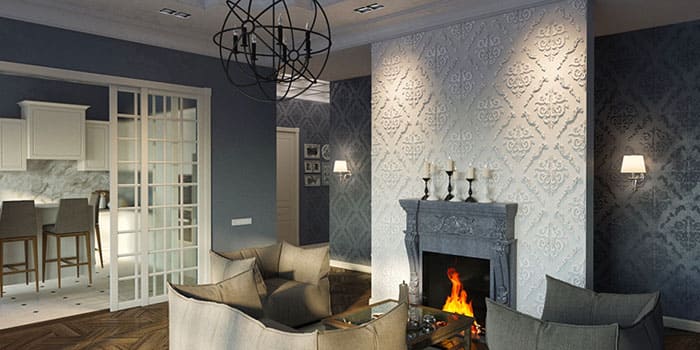 Dindingnya dihiasi dengan panel volumetrik dengan tuntutan keaslian dan gaya. Suasana tertentu diciptakan di dalam ruangan, kerana hiasannya dapat menonjolkan beberapa bagian dinding, atau, sebaliknya, mengalihkan perhatian.