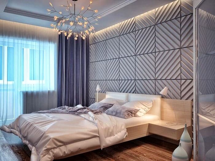Di bilik tidur, panel dinding digunakan untuk menghias dinding berhampiran kepala katil... Sebenarnya, ini adalah tempat yang paling sesuai untuk penempatan. Penting untuk menjaga gabungan tekstur dan warna yang harmoni: anda boleh memberi penekanan kecil pada bahagian dinding, dan bagi seseorang, kemasan lengkap seluruh permukaan di atas tempat tidur akan sesuai.