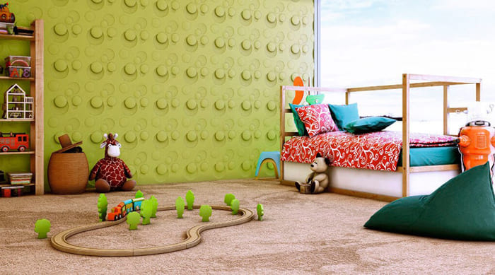 Model untuk kanak-kanak tidak begitu popular, tetapi masih ada pilihan. Ini boleh menjadi panel "di bawah Lego", lekapan geometri, bergelombang. Sebaiknya tinggalkan hiasan ini di kawasan permainan.