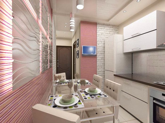 Dapur dan ruang makan kelihatan sangat menarik ketika dilapisi dengan kesan 3D. Plastik dan MDF sangat sesuai untuk bilik dengan tahap kelembapan yang tinggi. Mana-mana bahan yang anda pilih, disyorkan untuk menggunakannya di ruang makan. Sekiranya dapur sangat luas, maka dua dinding dibezakan, ini membolehkan sebuah bilik besar dianggap lebih holistik.