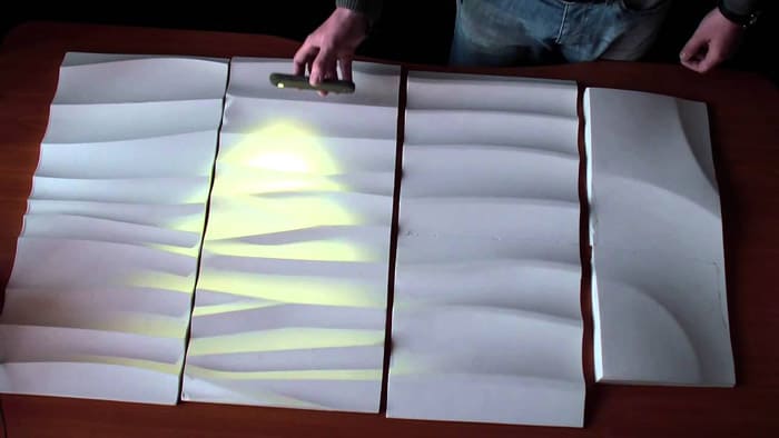 Ruang tamu paling kerap menjadi objek hiasan seperti itu. Panel yang paling menguntungkan kelihatan di zon TV... Sekiranya lekapan berbentuk gelombang, riak di atas air, bentuk geometri, maka reka bentuk bilik memerlukan lebih sedikit aksesori.