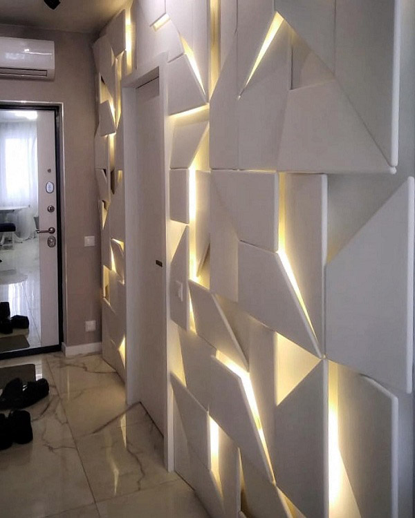 Semasa memilih pencahayaan papak dinding pukal, keutamaan diberikan kepada beberapa sumber. Dengan bantuan cahaya lembut, anda berjaya menekankan corak dan kelegaan, menonjolkan kedalaman, dan menunjukkan hiasan.