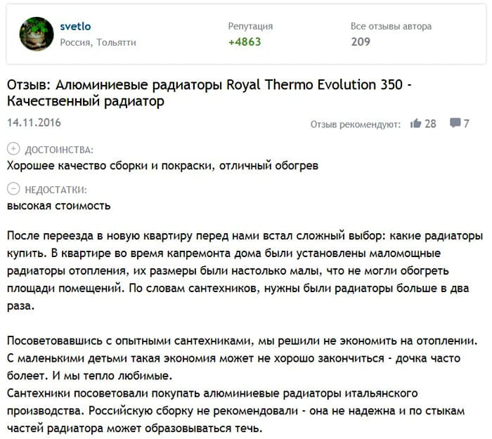Ulasan radiator aluminium "Royal Thermo Evolution 350":