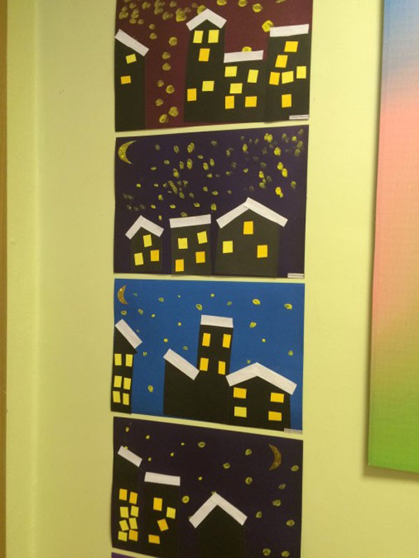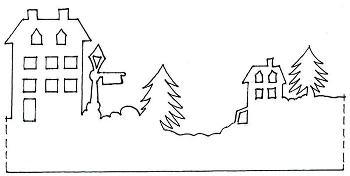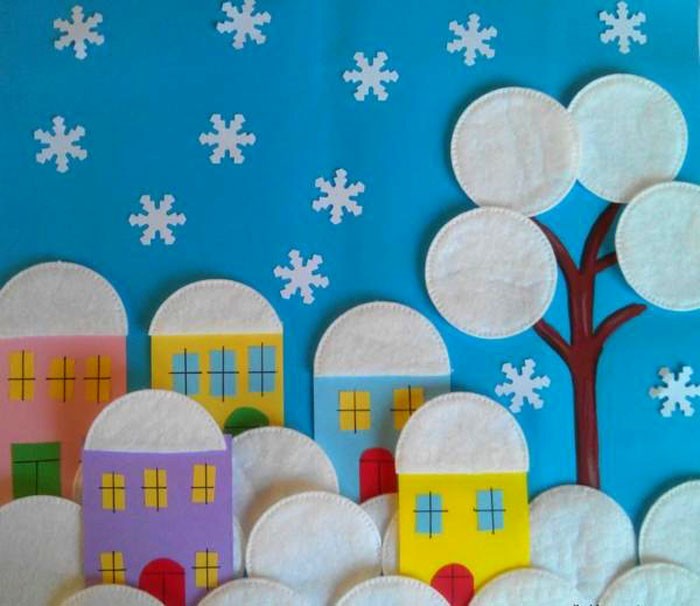 Pekerjaan yang menarik dan tidak rumit adalah mewujudkan bandar bersalji. Inti idea: dengan meletakkan sosok segi empat tepat - sebesar rumah dan sekecil tingkap - menimbulkan kesan sebuah kota tertidur di bawah salji salji.