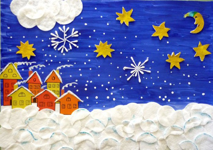 Anda boleh menjadikan hiasan untuk percutian menjadi sempurna dengan pelbagai cara. Beberapa aplikasi "meminta" untuk dihiasi dengan payet berkilat. Bintang-bintang terang diciptakan di langit malam: gam PVA menetes di tempat-tempat di mana bintang-bintang harus menyala, dan kilauan emas, putih atau perak ditaburkan di atasnya. Sebaik sahaja lem mengering, anda perlu meniup sedikit untuk berfungsi - kilauan tambahan akan melayang, meninggalkan di langit cahaya bintang-bintang yang indah.