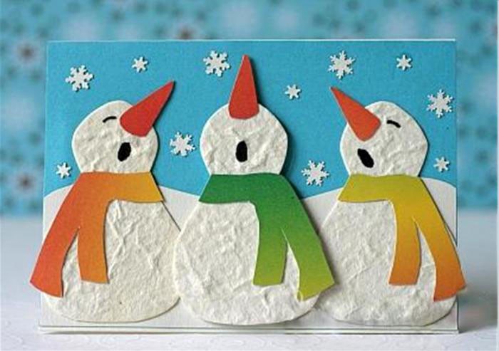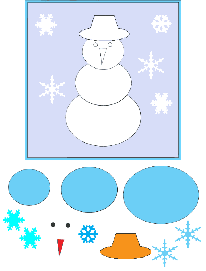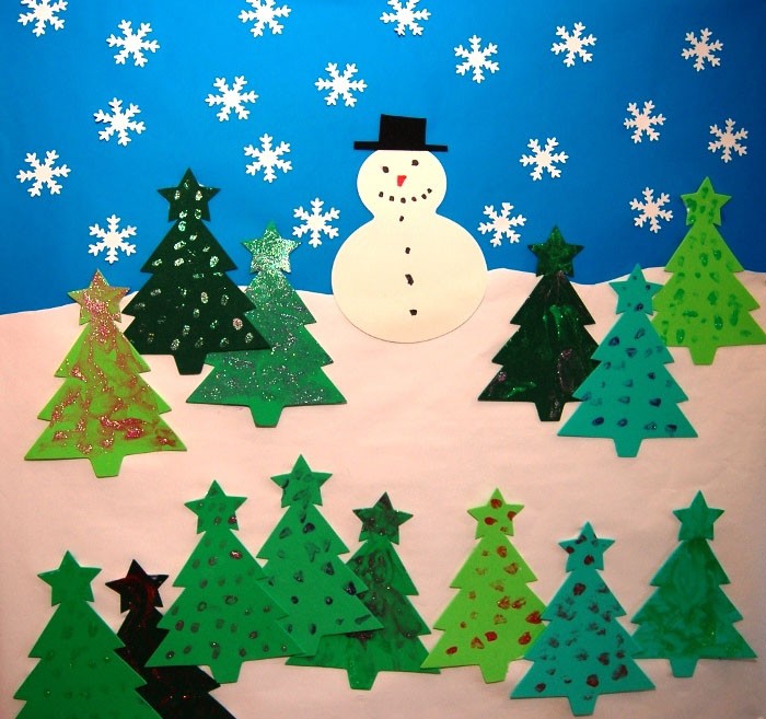 Kepingan salji dibuat sama ada dengan merobek kertas, atau dengan menempelkan bulu kapas atau corak yang serupa dari bawah pukulan lubang yang digambarkan
