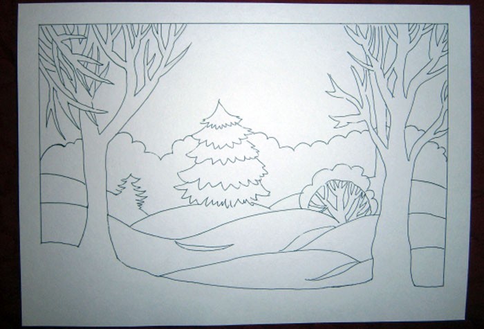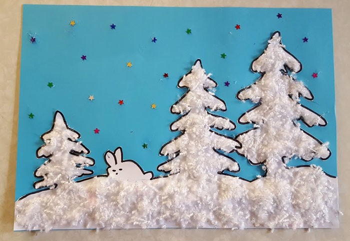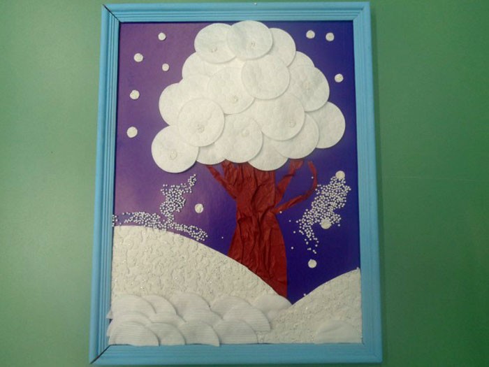 Untuk membuat pokok, anda boleh melipat sehelai daun, menggambar pokok musim sejuk di salji pada separuh, dan memotong kedua-dua bahagian sekaligus.