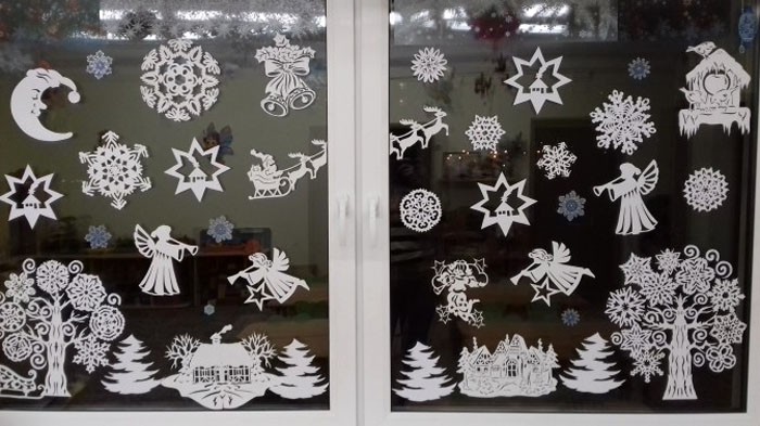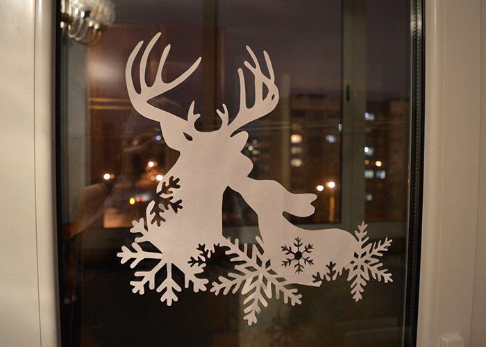 Tidak baik meninggalkan permukaan yang indah seperti kaca tanpa kreativiti. Oleh itu, kami memilih aplikasi potongan yang sesuai untuk Tahun Baru di tingkap.