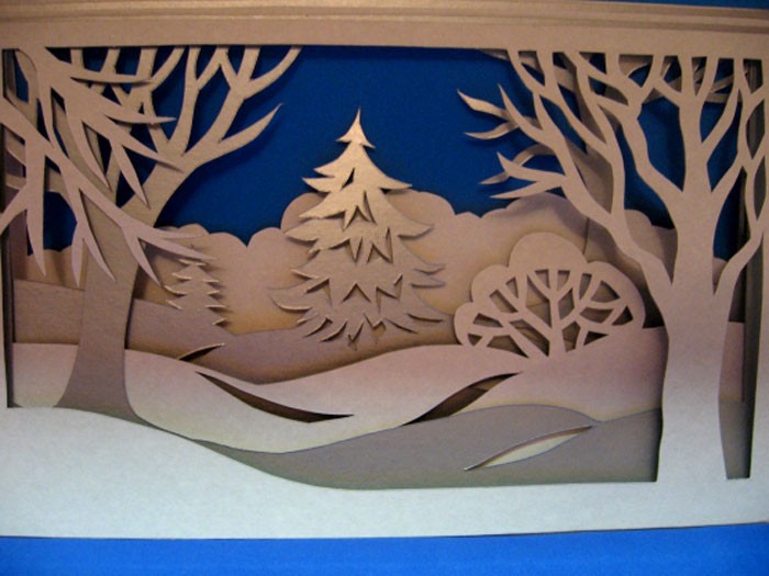Dalam karya sedemikian, jurang antara lapisan digunakan. Maksudnya, lapisan dengan semua elemennya dipotong sekaligus. Setiap lapisan dijauhkan dari yang sebelumnya pada jarak tertentu. Ia sangat indah apabila jalur LED dilalui di antara mereka.