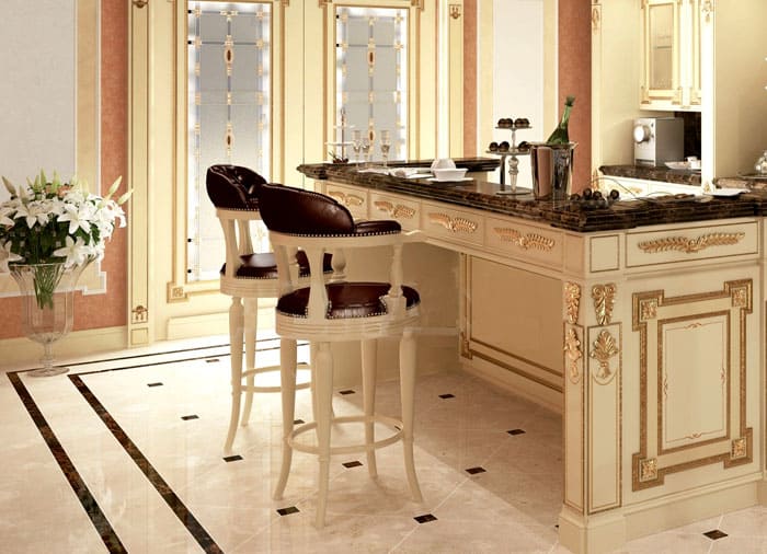 Semakin ramai yang lebih suka gaya moden di kawasan pedalaman. Tetapi mereka tetap tidak peduli dengan kemewahan yang elegan: gaya Empire menghangatkan jiwa para penikmat keanggunan di pedalaman. Bangku bar dalam gaya ini nampaknya tidak sesuai jika anda memilih pilihan yang tepat.