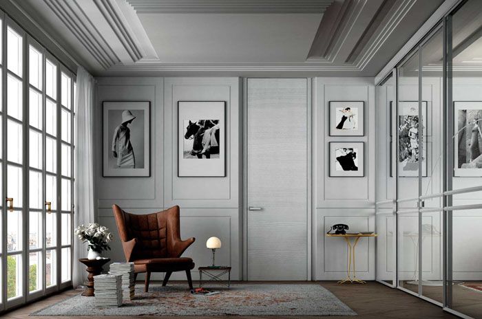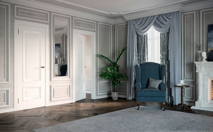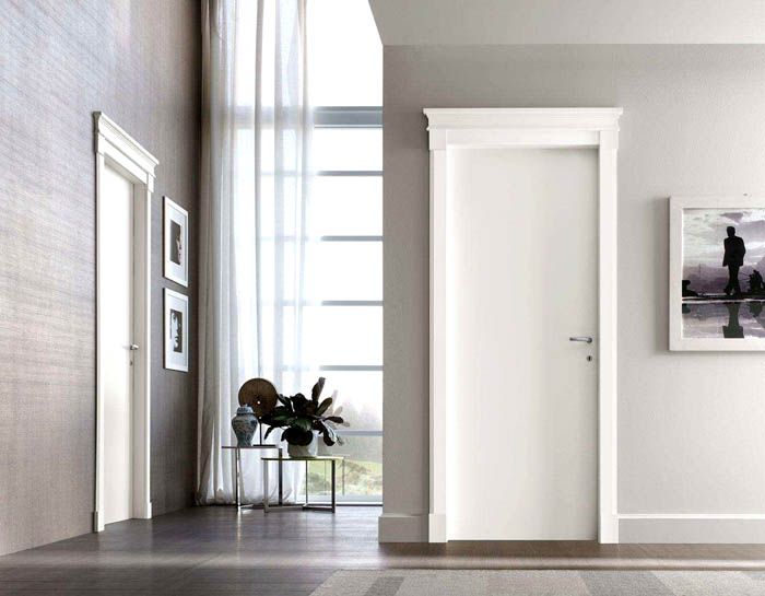 Daun pintu putih klasik sangat sesuai untuk reka bentuk klasik. Keharmonian garis, gabungan pompa dan pertapaan, perkadaran dan simetri yang tepat, pembinaan bingkai atau panel.