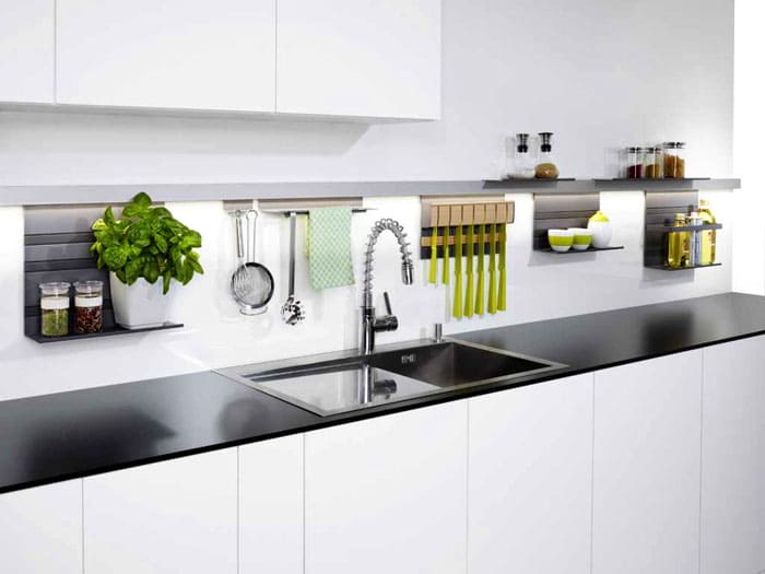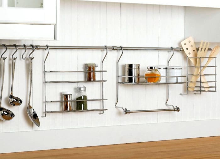 Banyak dapur moden kekurangan ruang. Penduduk terpaksa menyelamatkan setiap ruang sentimeter persegi. Ini dapat dilakukan dengan berjaya mengisi ruangan. Untuk ini, selain perabot utama, rel atap, kabinet, rak dan kotak untuk menyimpan pelbagai barang dan produk telah menjadi penyelesaian yang berkesan.