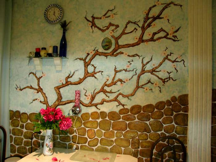 Bukan hanya lukisan, rak dan jam yang diletakkan di dinding. Kadang kala penyelesaiannya boleh diambil dari persekitaran semula jadi - alam. Tidak ada yang berjanji untuk menggunakan kayu asli sahaja, pendekatannya tidak standard!