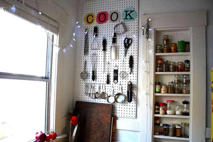 Sebelum ini, semua peralatan dapur tersembunyi di dalam almari dan laci. Dengan tin berwarna-warni dan tin biskut yang diekstrak dari perut almari, dinding dapur dapat diubah dengan mudah tanpa memerlukan ruang penyimpanan tambahan.