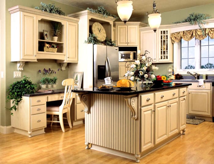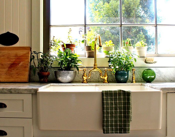 Dapur sering mengandungi ruang makan. Tetapi walaupun tanpa ruang makan, dapur dihiasi dengan indah. Mengapa tidak meletakkan beberapa pasu bunga di sana?