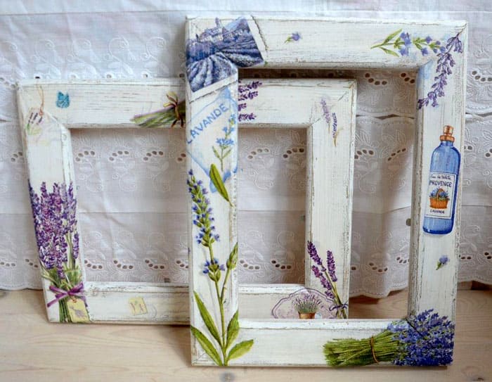 Bingkai kayu boleh dicat dan dipernis, yang juga akan berfungsi sebagai lapisan pelindung; kesan menepuk dan penuaan dengan bantuan varnis craquelure kelihatan bagus.