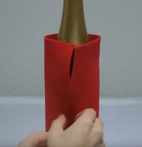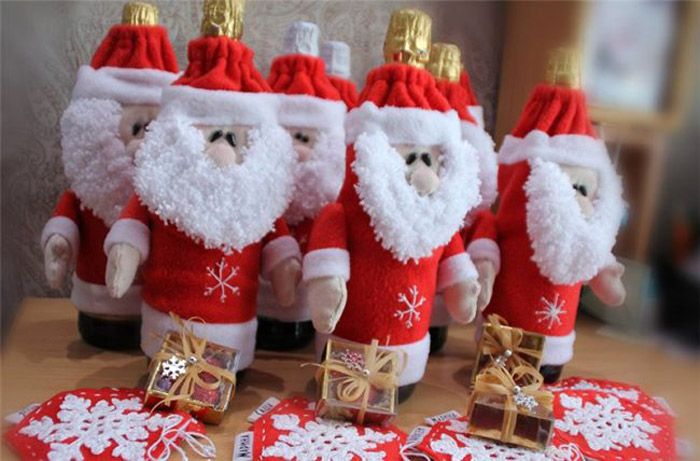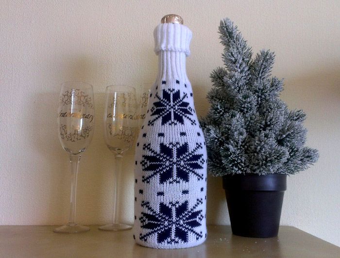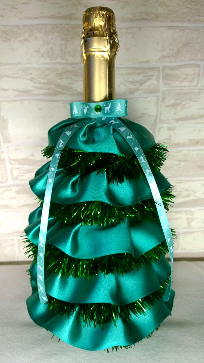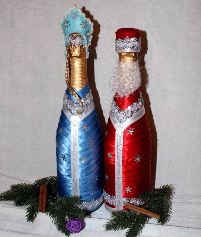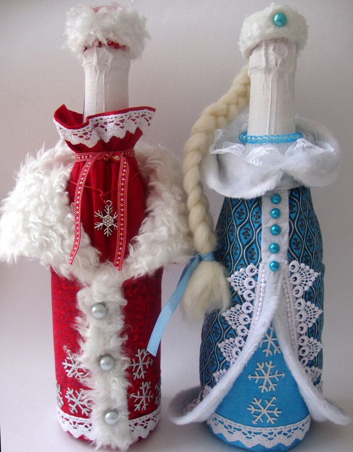 Hiasan yang mewah untuk sebotol sampanye diperbuat daripada kain. Pakaian seperti itu juga dibuat sebagai pakaian untuk Kakek Frost dan Snow Maiden.