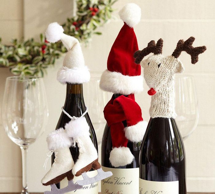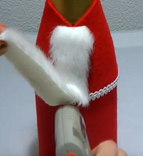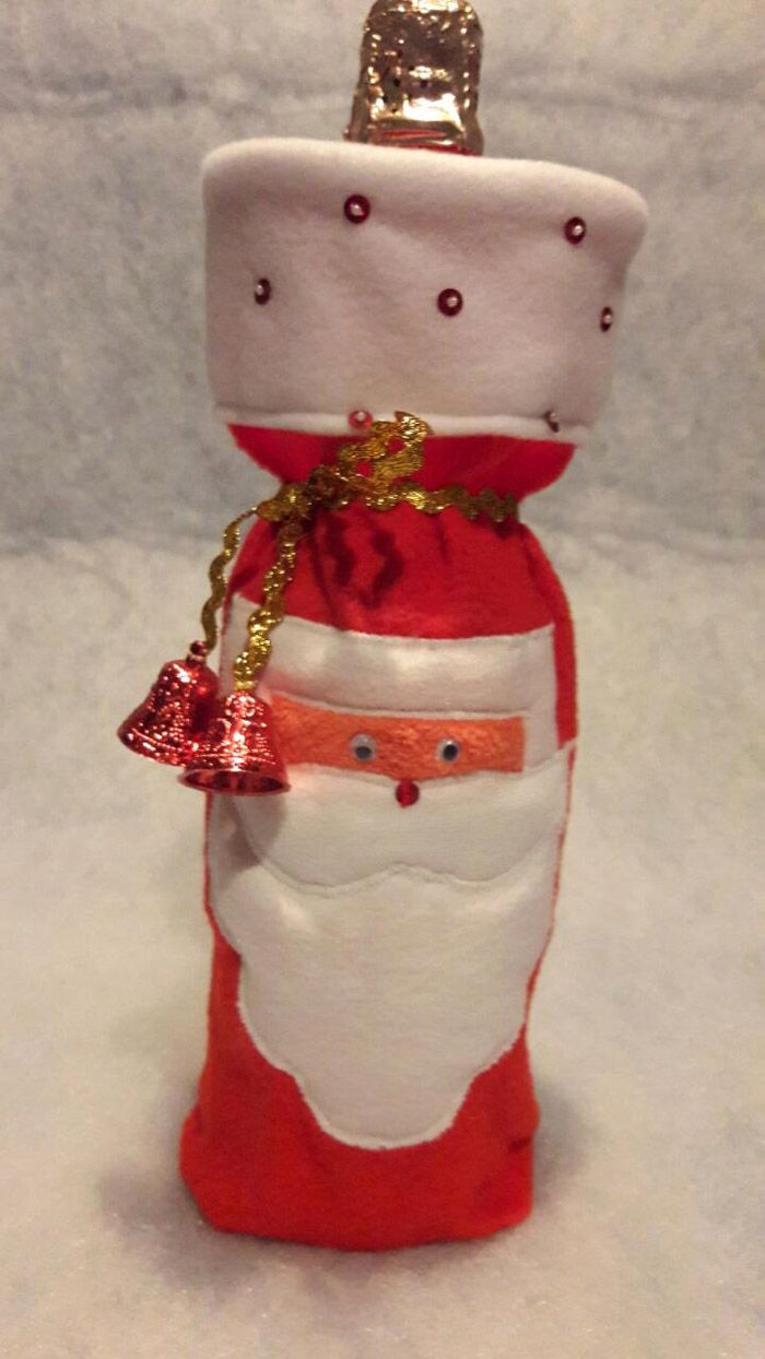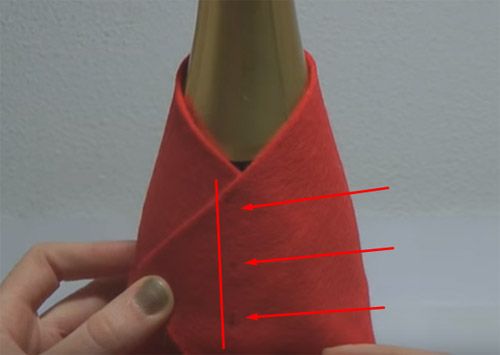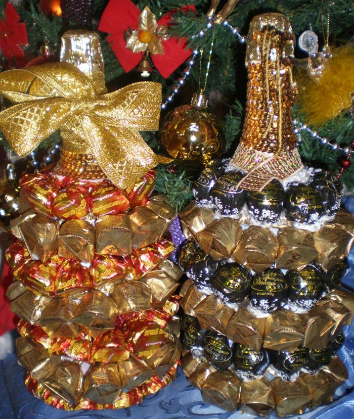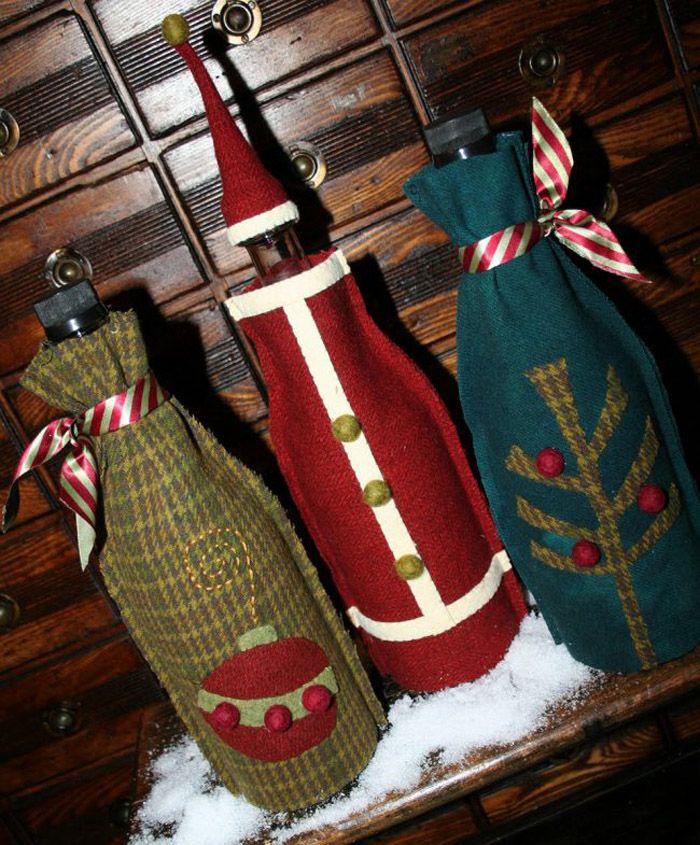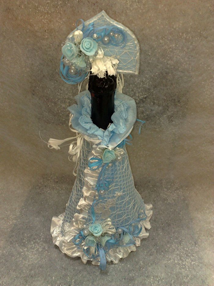 Hiasan yang mewah untuk sebotol sampanye diperbuat daripada kain. Pakaian seperti itu juga dibuat sebagai pakaian untuk Kakek Frost dan Snow Maiden.