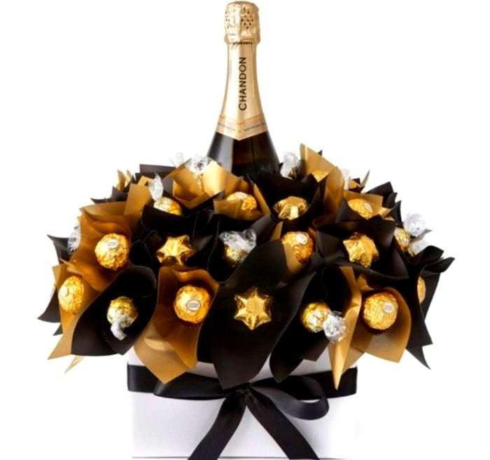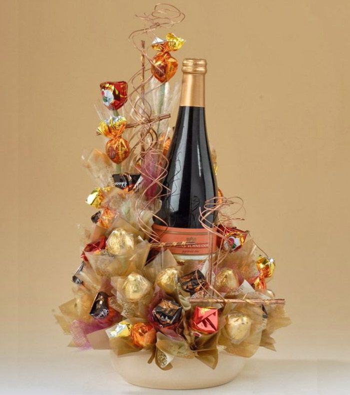 Menghias dengan bunga gula-gula memerlukan bakul atau kotak yang dihiasi. Di dalam kotak, ruang ditinggalkan untuk sebotol, selebihnya ruang dihuni oleh hiasan lain