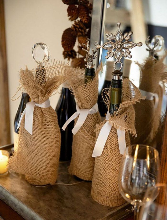Hadiah sebenar dengan tema neutral. Botol boleh dikeluarkan dengan senang dari hiasannya dan juga mudah dimasukkan ke belakang