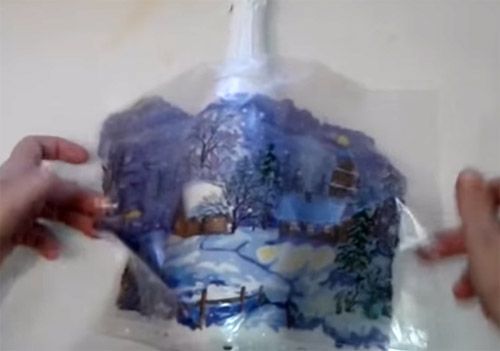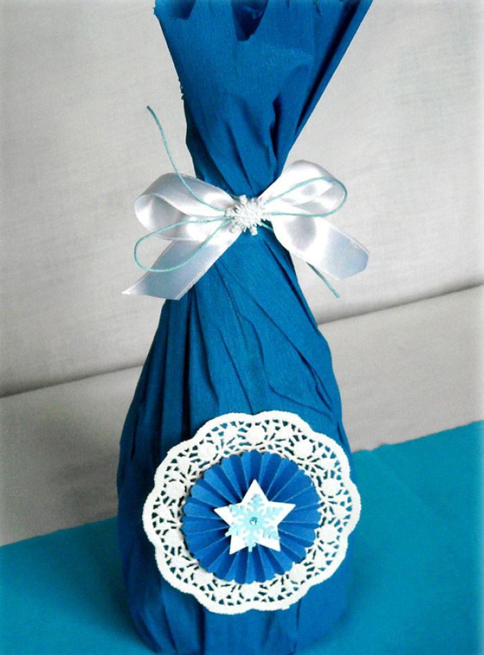 Dengan satu helai kertas kami membina "beg" di sekitar botol, meraihnya di pangkal leher dengan pita atau tocang. Bintang kepingan salji dibuat dari serbet bulat hiasan dan kertas segi empat tepat, dilipat terlebih dahulu di kipas, dan kemudian dalam bulatan