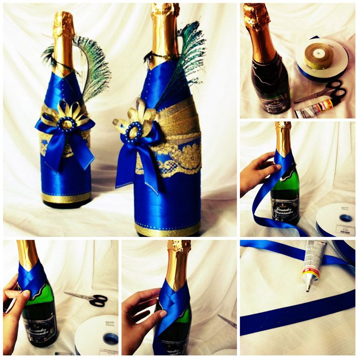 Kami menghias sampanye dengan tangan kami sendiri: kami menggunakan pita dan manik