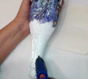 Kerja peringkat demi peringkat pada hiasan. Perkara yang paling sukar adalah mengumpulkan semua elemen hiasan pada botol. Senapang termo akan membantu dengan ini. Anda boleh membuat hiasan secara berasingan, tetapi sama mudahnya untuk memasangnya satu demi satu berdasarkan