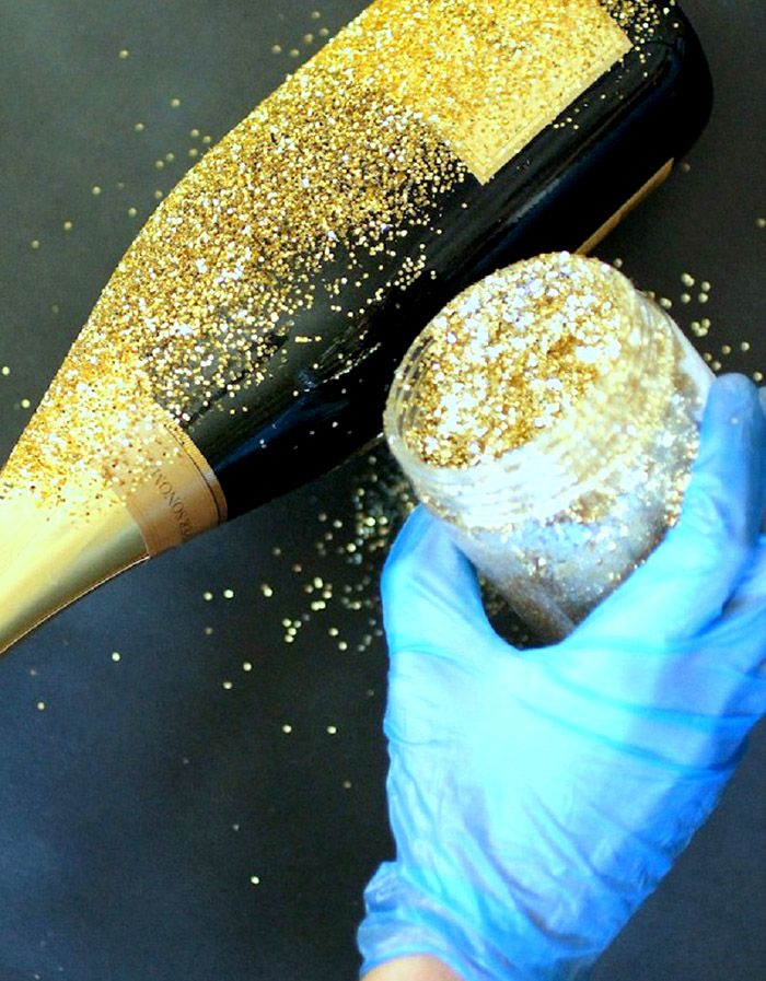 Glitter (payet) dijual di kedai kraf. Balang yang lebih besar adalah wajar. Lapisan gam PVA yang baik digunakan pada botol dan permukaannya ditaburkan dengan glitter. Tidak digalakkan menyentuh kerajinan sehingga kering sepenuhnya.