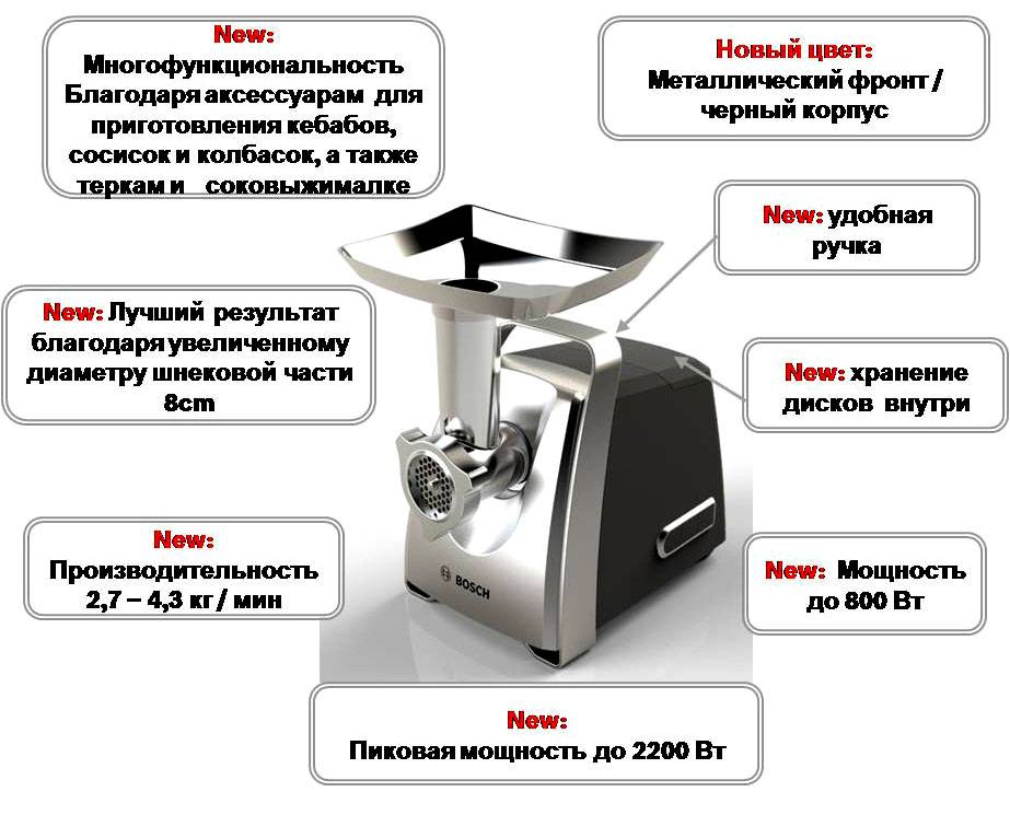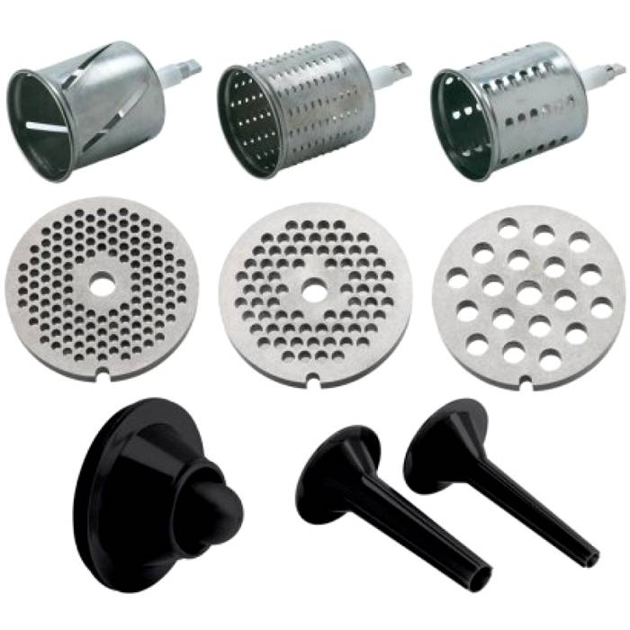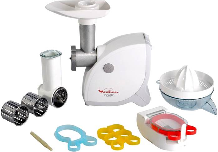 Maklumat menarik! Model moden dilengkapi dengan lampiran khas, yang diperlukan untuk pengeluaran puri, irisan atau sosej. Terdapat muncung khas untuk membuat tiub berongga dan sosej yang disumbat. Beberapa produk termasuk parutan, pemotong sayur atau juicer.