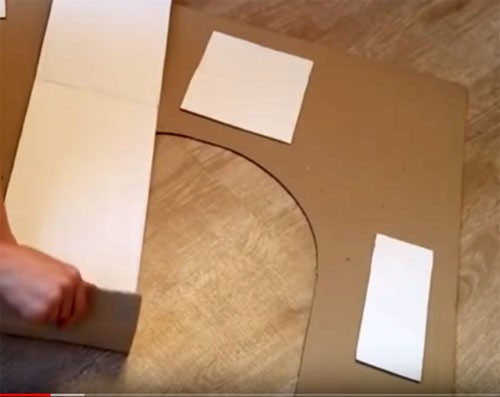 Lukiskan bukaan depan di bahagian depan, potong bahagian separuh bulatan dari atas, tetapi jangan sampai ke bahagian bawah. Di bahagian bawah kami menarik sudut yang sesuai dari kotak api dan, setelah memotongnya, bengkokkan ke dalam. Kami membentuk dinding sudut dari kepingan kadbod yang terpisah dan lekatkannya dengan pita pelekat.