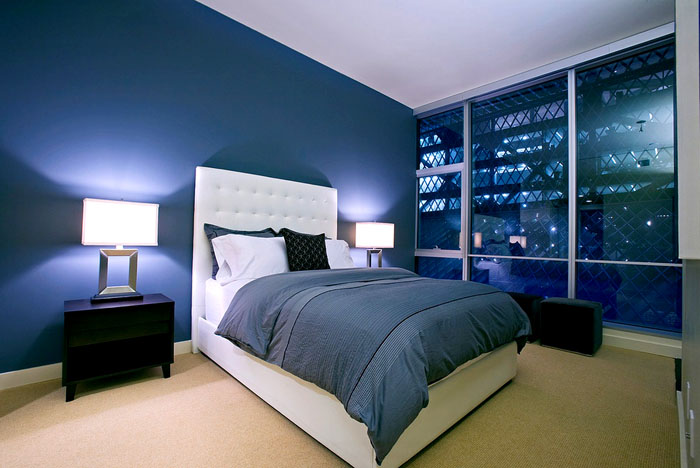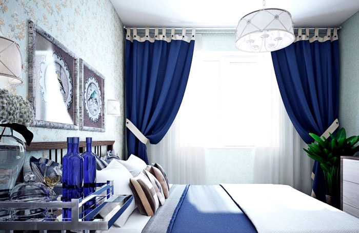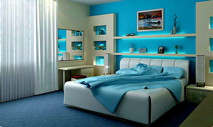 Dan biru boleh didapati dalam warna hangat dan sejuk. Nada biru sering digunakan di bilik tidur, sebagai merehatkan dan melepaskan kepala dari pemikiran berat. Tetapi apabila ada banyak warna biru, melankolis muncul, dan untuk menghindarinya, warna hijau ditambahkan padanya, yang menyerupai ombak laut.